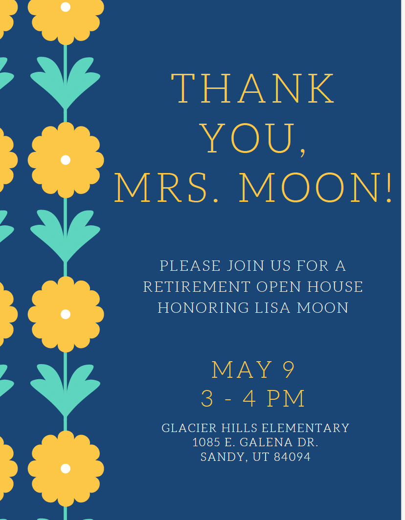 We would like to announce the retirement of Lisa Moon, our esteemed third-grade teacher. We warmly invite the community to celebrate her contributions at a retirement open house on May 9th, from 3:00 to 4:00 PM in the media center.